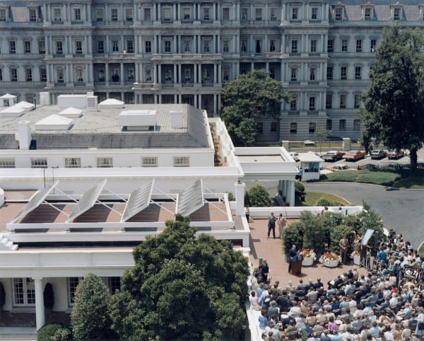 By Austyn GaffneyYou are browsing in data-saving mode, where images are disabled. Aerial photograph of the dedication ceremony for solar panels installed on the roof of the West Wing of The White House. Click to open the image